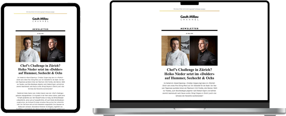 Der Gault-Millau Channel informiert Foodies & Geniesserinnen und Geniesser 365 Tage im Jahr, rund um die Uhr: Rezepte, Videos, Storys, Interviews, Breaking News – direkt aus den besten Küchen im Land. Andreas Caminada ist unser «Anchorman». Der Newsletter, der jeden Sonntag Punkt 9 Uhr erscheint («Wort zum Sonntag»), ist Kult in der Szene. Die Abonnentinnen und Abonnenten? Food-Lovers. Und die Profis der Branche.